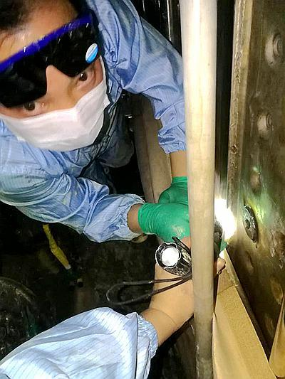 “牽一發(fā)而動全身,設(shè)備出問題就得停工,就會影響我們防疫藥品的生產(chǎn)進(jìn)度”,這讓他倍感壓力。可即使這樣,擔(dān)心的事還是發(fā)生了。2月2日上午9時,帶式真空干燥機(jī)加熱板出現(xiàn)漏水,導(dǎo)致正在進(jìn)行的金銀花帶干干燥工序停止。如不能及時修好就會影響整個下游工序的生產(chǎn)。設(shè)備主管鄒博立即組織維修人員排查,問題點(diǎn)很快找到——加熱板破裂。維修方法不難,只要將破裂的加熱板焊接好就行,但問題在于加熱板所在位置結(jié)構(gòu)緊湊,空間狹小,人員、設(shè)備很難施展,無法實(shí)現(xiàn)精準(zhǔn)焊接,維修人員多次嘗試均以失敗告終。車間將問題報告設(shè)備管理部,向廠家求援,但得到的回復(fù)是廠家維修人員第二天才能到。